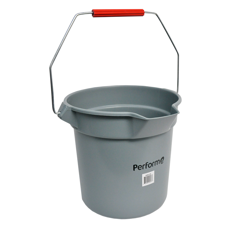 Seau Performe à usages multiples gris avec bec verseur, anse de métal et poignée de plastique.