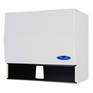 Distributeur pour papier à main plié ou en rouleau sans barrure. Ce produit distribue les serviettes manuellement et ne nécessite aucun levier ou interrupteur supplémentaire pour fonctionner. Ce produit est également universel; ce qui signifie que l'unité distribue du papier des producteurs de papier commercial standard.