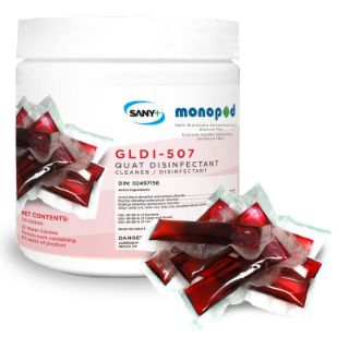 Capsule hydrosoluble, Monopod GLDI-507 est le nettoyant désinfectant concentré idéal pour désinfecter, nettoyer, assainir et désodoriser les surfaces dures, lavables, non poreuses comme les planchers, les murs, luminaires, comptoirs, éviers, baignoires et douches, toilettes, urinoirs, poubelles et plus encore. Facile d'utilisation : ajouter une capsule de produit nettoyant à un litre d'eau dans une bouteille, dissoudre et utiliser selon les directives. Le nettoyant désinfectant, homologué par Santé Canada, élimine 99,99% des virus, bactéries, champignons, et moisissure lorsqu'il est utilisé selon le mode d'emploi.